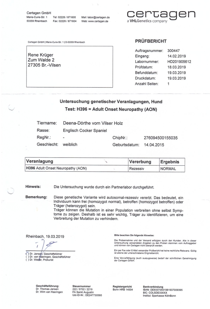 | Zuchttauglichkeit: | Uneingeschränkt zuchttauglich, BZS Hamburg/Norderstedt 18.06.2016, Richter: R. Sommer Ergebnis TeilI ansehen Ergebnis Teil II ansehen |