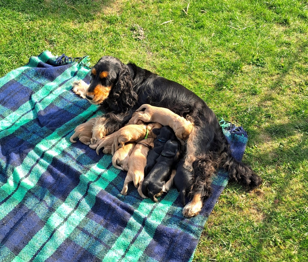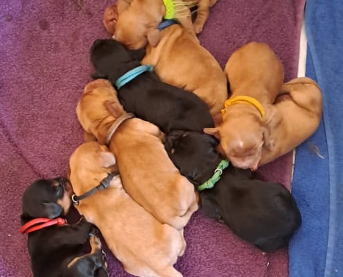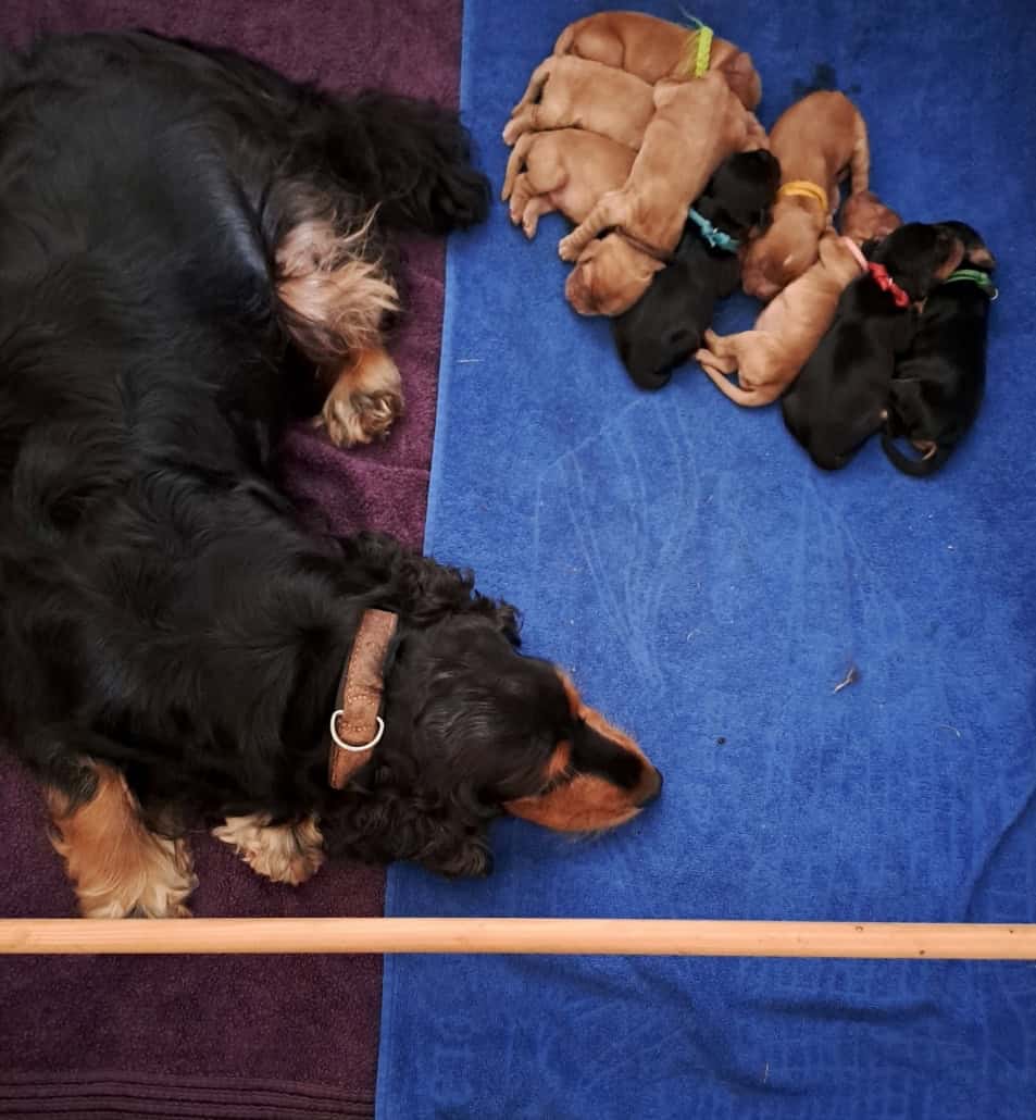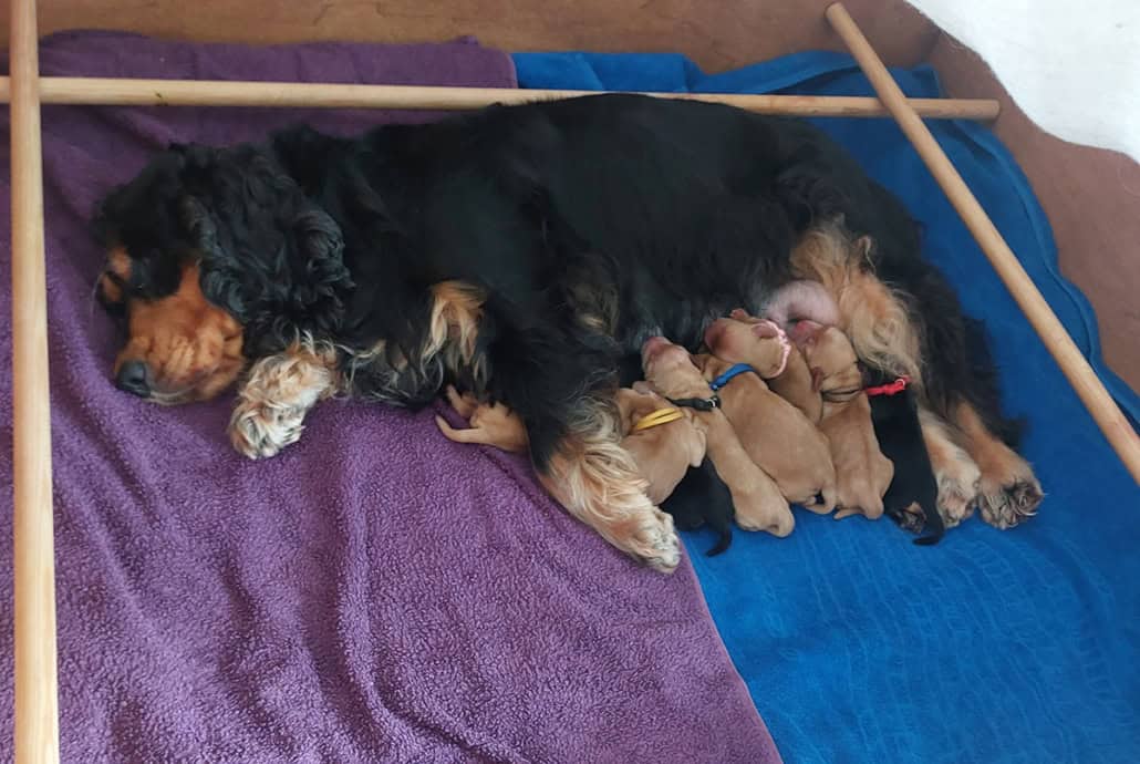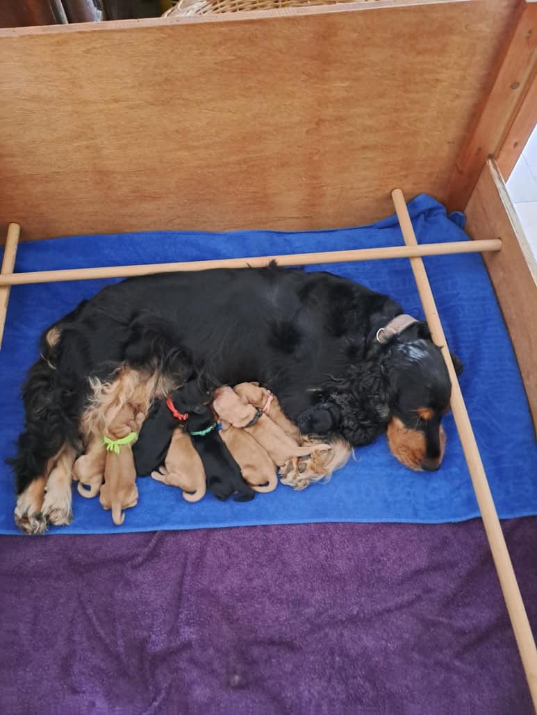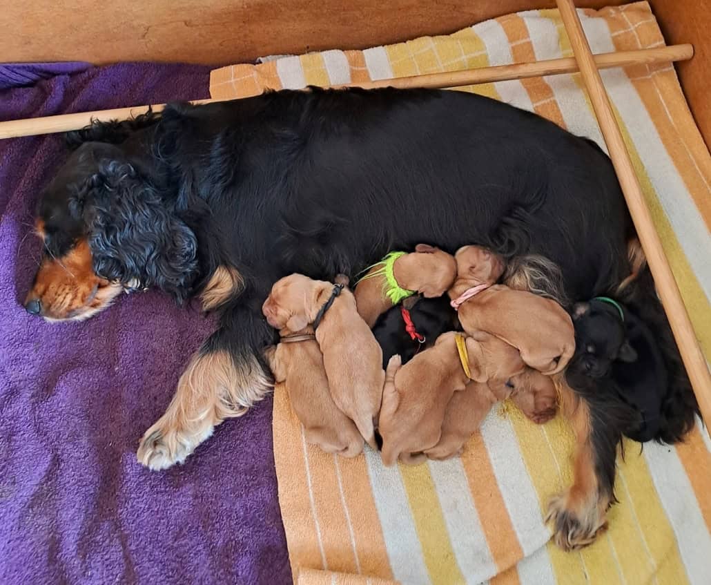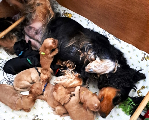 Frida ist eine sehr fürsorgliche Mutter und kümmert sich vorbildlich um den sehr agilen Wurf. In sehr kurzer Zeit erblickten 9 Welpen das Licht der Welt.